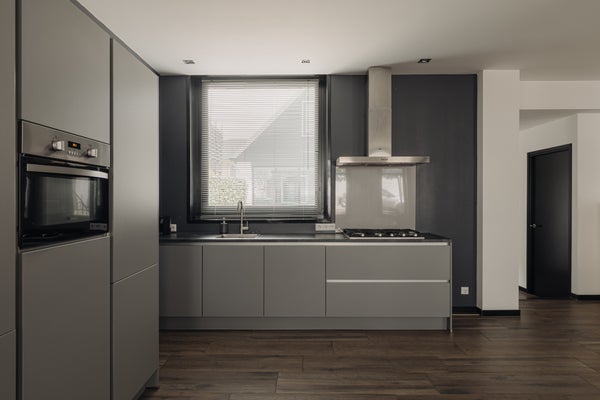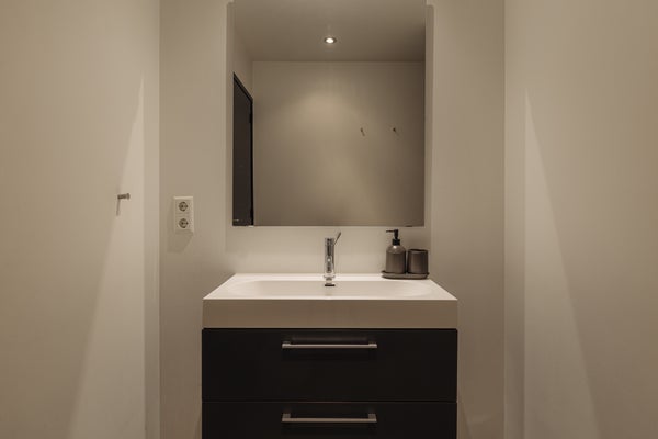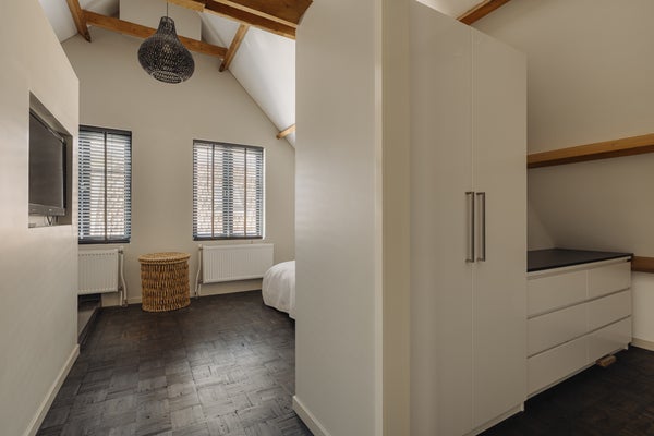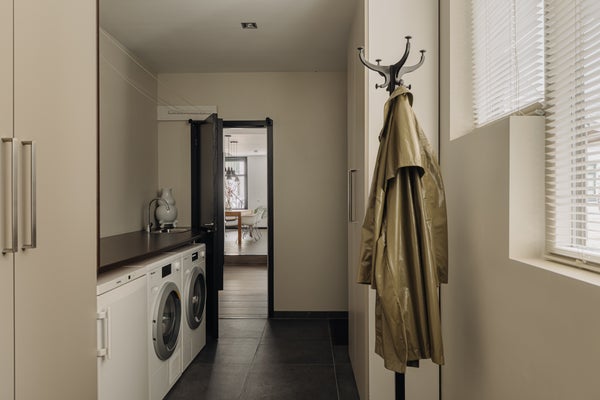 The hallway also provides access to a separate toilet with washbasin and mechanical ventilation, two storage cupboards under the stairs where the underfloor heating distribution unit is located, and an industrial freight lift currently used as a walk-in wardrobe. From the hallway there is access to the large utility room with ample storage space, room for a washing machine, dryer and freezer, and a large worktop with sink. This room has a door to the side garden and provides access to the street-facing part of the house. This section is currently arranged as a separate residence but can be integrated into the main house or used for another purpose.