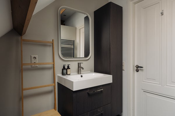 Via een wenteltrap bereikt u de overloop op de eerste verdieping. Hier bevindt zich de cv-installatie, wasmachineaansluiting en ruimte voor een droger. Vanuit de overloop is de tweede slaapkamer bereikbaar, voorzien van een aparte doucheruimte en wastafelmeubel.