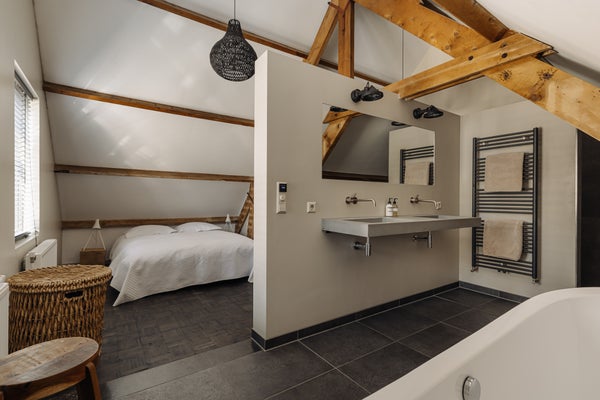 Via een open houten trap in de hal bereikt u de eerste verdieping, waar zich in totaal vier ruime slaapkamers bevinden. De gang op de eerste etage is breed, hoog en indrukwekkend door de houten balkenstructuur. Aan de achterzijde liggen twee ruime slaapkamers, met daarnaast een derde slaapkamer aan de zijkant van de woning. Aan de voorzijde bevindt zich de royale master bedroom, compleet met een ruime inloopkast en een luxe badkamer ensuite. Deze badkamer is uitgerust met een comfortabele inloopdouche, dubbele wastafel, een vrijstaand bad en heeft aangenaam daglicht door 2 grote ramen. Verder vindt u op deze verdieping een tweede badkamer met inloopdouche, wastafelmeubel- en kast en een separaat toilet. De gehele verdieping is voorzien van een houten vloer.