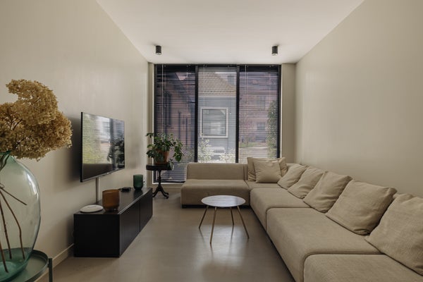 This section is currently arranged as an independent living unit with its own entrance and private driveway, located at the street side of the property. It is accessible internally but can also be completely separated from the main residence. The hallway provides access to a separate toilet, a bedroom, a bathroom with walk-in shower and a bright living and dining area with open kitchen. The living room is situated at the front and the large windows offer views of the lively village street and plenty of natural light. The ground floor is finished with a warm tiled wood-look floor and equipped with radiators. The kitchen is fully fitted and includes a combi oven, refrigerator, freezer and gas hob. There is a front garden facing the street and a side garden with driveway.