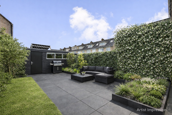 The spacious back garden is approximately 11.60 metres deep and 5.70 metres wide and is conveniently located on the sunny south/east, allowing you to enjoy the sun almost all day long. The garden has a practical back entrance, a stone shed for bicycles and garden tools, and an extra storage cupboard right next to the back door of the kitchen — ideal for extra storage.