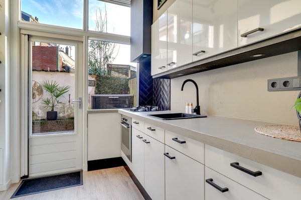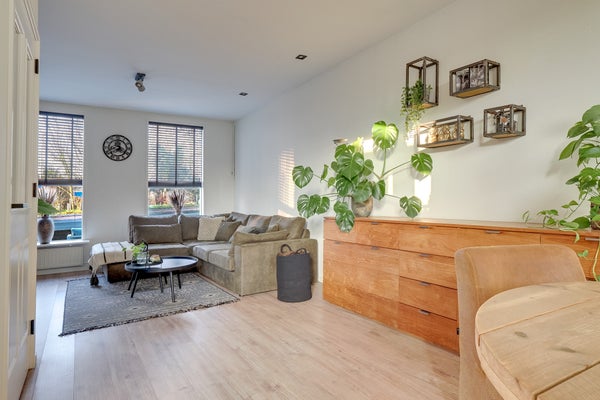 Bij binnenkomst in de hal met toilet bereik je de woonkamer, die door de hoekligging veel lichtinval heeft. De open keuken is praktisch en biedt voldoende werkruimte, met toegang tot de verzorgde achtertuin op het oosten.