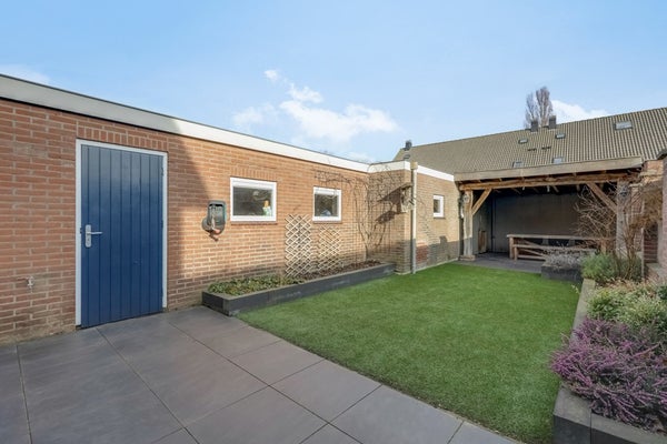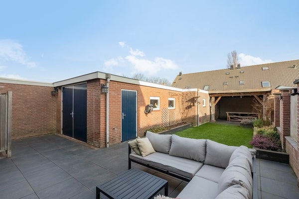 Via een openslaande houten poort is de achtertuin bereikbaar waar zich ook de garage van 53 m² met een pulspomp bevindt. Deze garage is ideaal als stallingsruimte maar biedt ook volop mogelijkheden als hobby- of werkplaats. De verzorgde achtertuin ligt op het oosten en beschikt over een overkapping, kunstgras, borders met beplanting en een ruim terras dat zich uitstrekt bij de openslaande tuindeuren van de woonkamer. De mooie groene voortuin is keurig aangelegd en de inrit biedt voldoende ruimte om eigen auto’s op eigen terrein te parkeren.