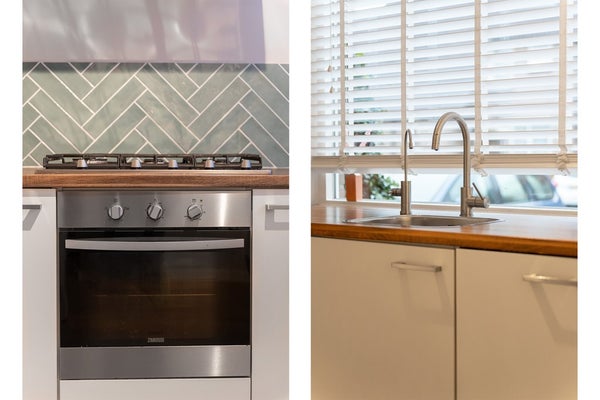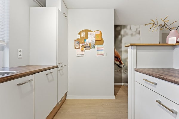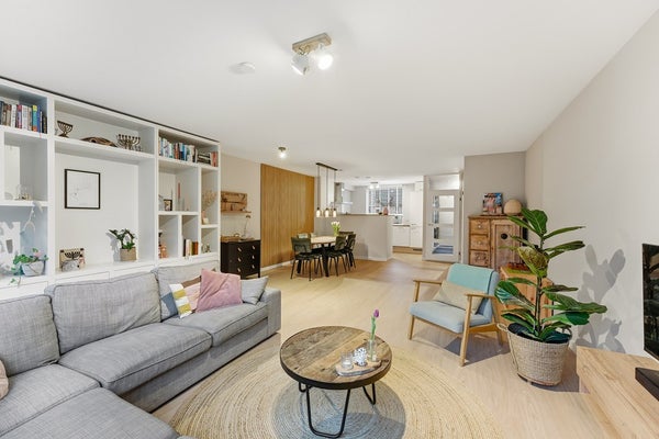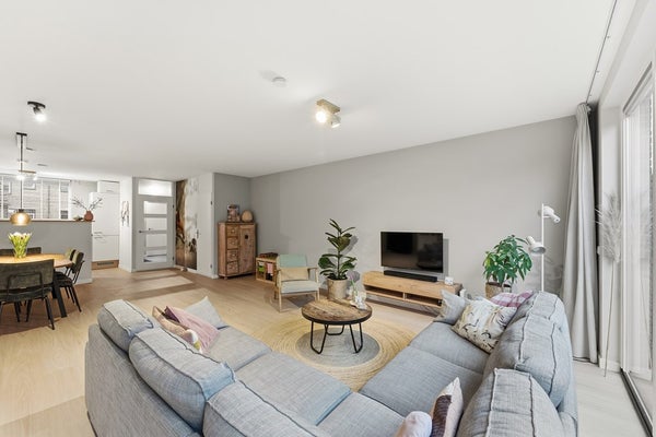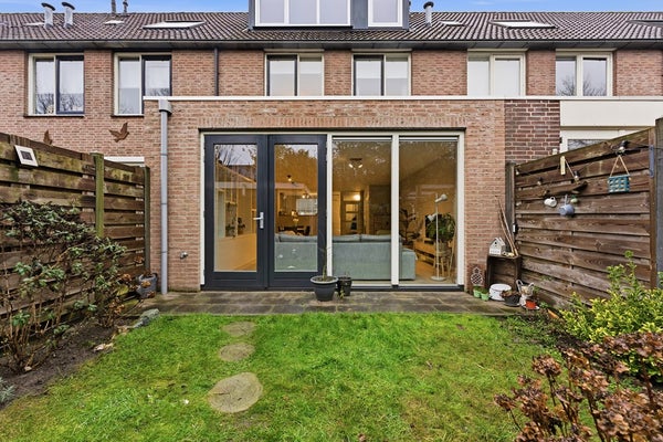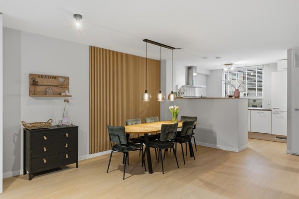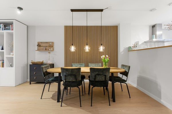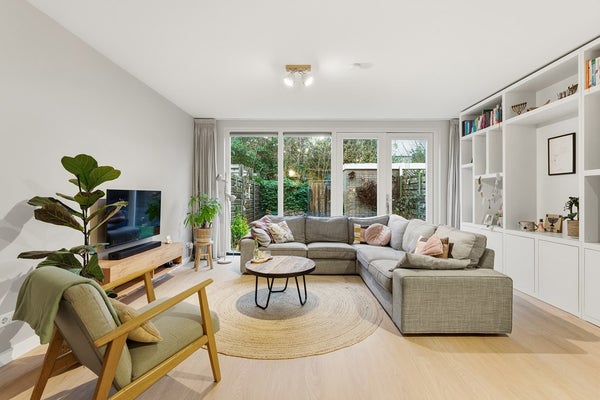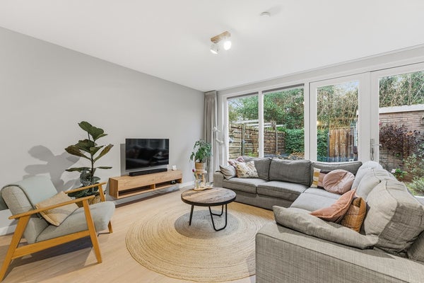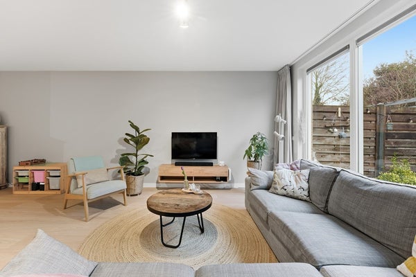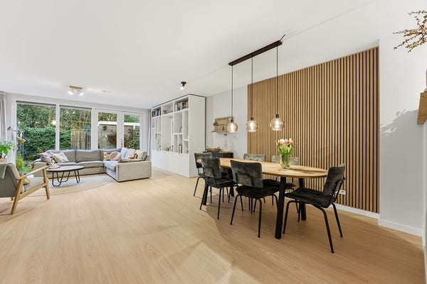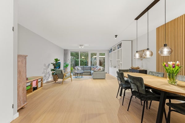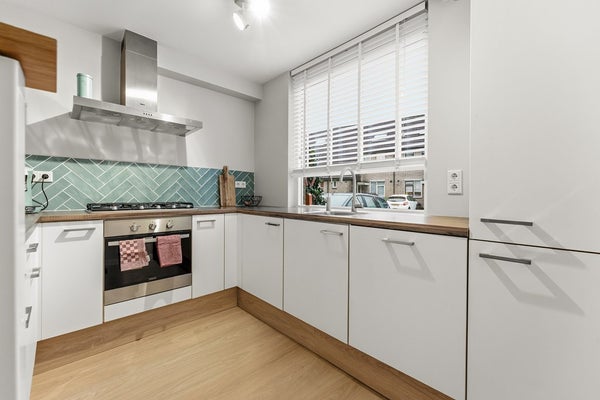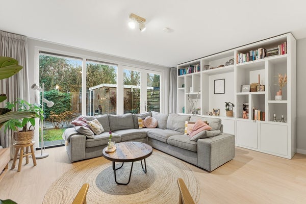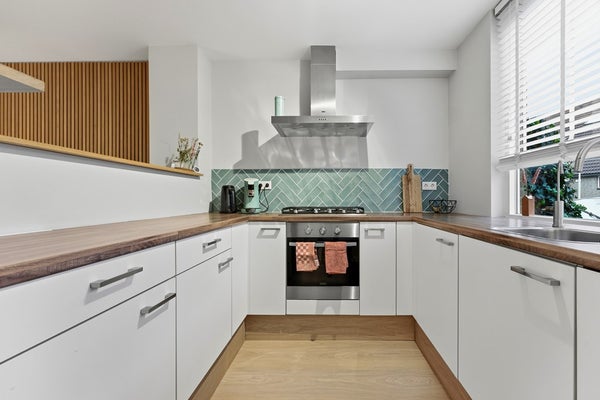 Woonkamer: De woonkamer is tuingericht en aan de achterzijde met wel 2,5 meter uitgebouwd, wat zorgt voor extra leefruimte. Doordat er achter de woning geen directe bebouwing staat en het alleen maar groen is, is het een heerlijke rustige plek. Via de woonkamer is de achtertuin bereikbaar en onder de trap bevindt zich een praktische trapkast. De woonkamer staat in open verbinding met de keuken aan de voorzijde. De afwerking bestaat uit een PVC-vloer met vloerverwarming, gestuukte wanden en een gestuukt plafond.