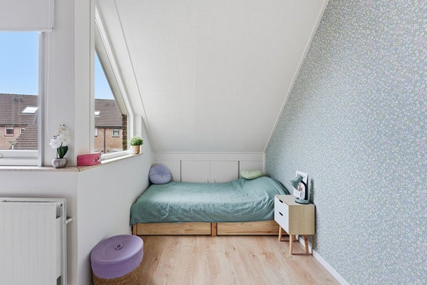 Slaapkamer 3: De derde slaapkamer ligt aan de voorzijde en heeft een speelse hoekindeling. Deze kamer kun je bijvoorbeeld inrichten als kinderkamer. De afwerking bestaat uit een laminaatvloer, behangwanden en een spuitwerkplafond.