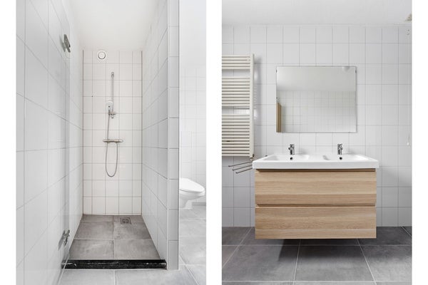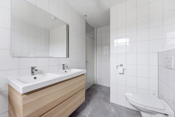 Badkamer: De ruime badkamer is volledig betegeld en ingericht met een inloopdouche, toilet, dubbele wastafel en een designradiator. De ruimte is praktisch opgezet in een rustige kleurstelling.
