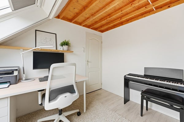 Slaapkamer 5: De vijfde slaapkamer ligt aan de voorzijde en is voorzien van een dakraam en een inbouwkast. Richt jij deze kamer in als werkkamer? De ruimte heeft zichtbare houten balken aan het plafond. De afwerking bestaat uit een laminaatvloer en behangwanden.