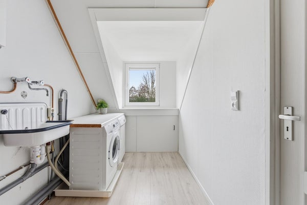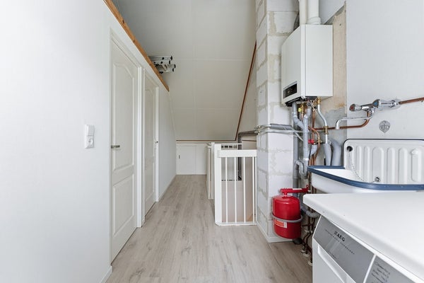 Overloop: De ruime voorzolder heeft een kunststof dakkapel aan de achterzijde. De overloop biedt ruimte aan de wasmachine, droger en de Cv-ketel. Er wordt toegang geboden tot twee slaapkamers en een bergzolder. De afwerking bestaat uit een laminaatvloer, glasvlies behangwanden en een delen plafond.
