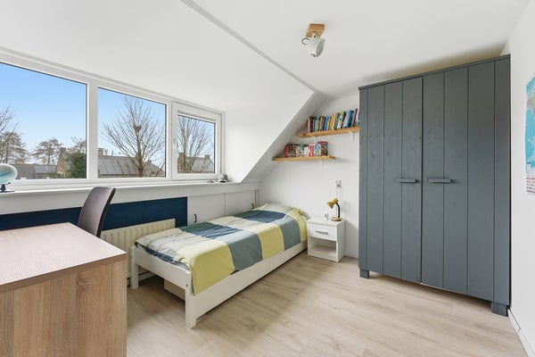 Slaapkamer 4: Slaapkamer vier ligt aan de achterzijde en beschikt over een kunststof dakkapel (2021). Er is een elektrisch rolluik aanwezig. Opbergschotten zorgen voor voldoende opbergruimte. De kamer is geschikt als slaapkamer, logeerkamer of hobbyruimte. De afwerking bestaat uit een laminaatvloer, glasvlies behangwanden en een gestuukt plafond.