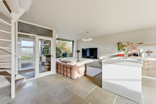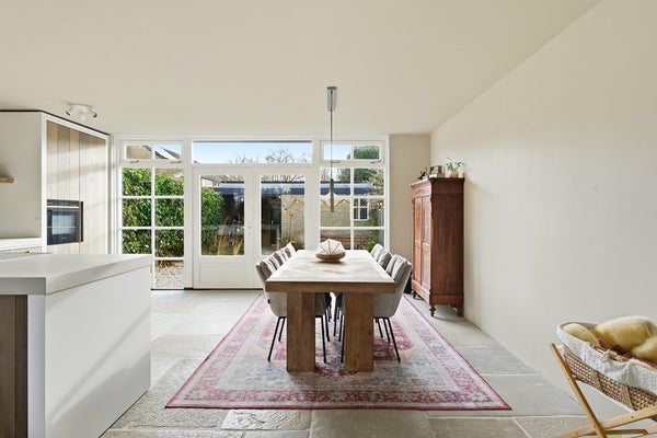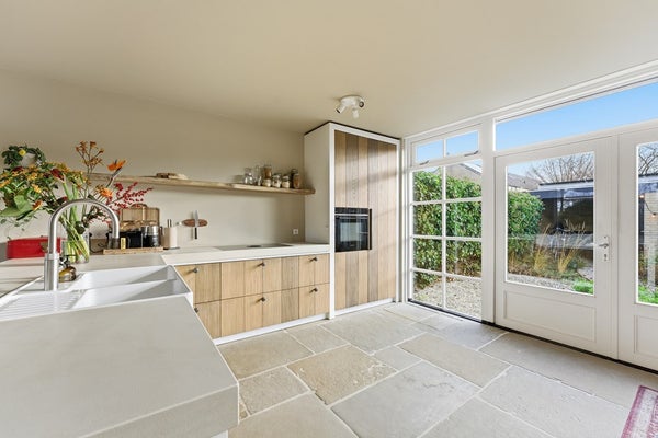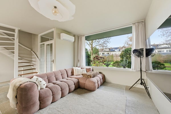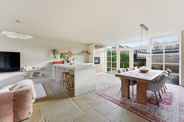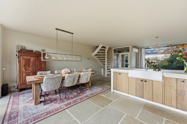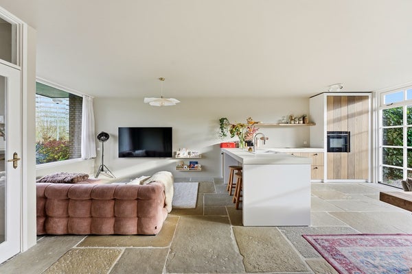 Woonkamer: De woonkamer is een ruime leefruimte met plaats voor een zit- en eethoek. Dankzij de indeling is er ruimte voor een aparte eethoek aan de achterzijde. Je zithoek plaats je gezellig aan de voorzijde met uitzicht op het groen en de sloot. Aan de achterzijde zorgt de nieuwe achterpui met openslaande deuren voor verbinding met de tuin en veel lichtinval. De pui heeft aan de linker- en rechterzijde een sfeervolle roedeverdeling. In de woonkamer is airconditioning aanwezig. De ruimte is afgewerkt met een prachtige RAW STONE vloer met vloerverwarming, gestuukte wanden en een gestuukt plafond.