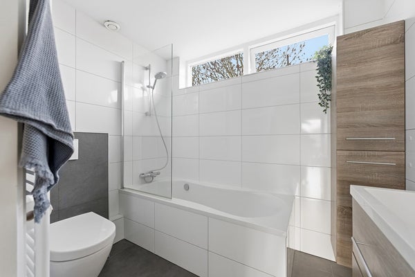 Badkamer: De nette badkamer is uitgerust met een ligbad, toilet en wastafelmeubel. Daarnaast zijn een designradiator en natuurlijke ventilatie aanwezig. De afwerking is volledig betegeld in een neutrale kleurstelling. Een prettige ruimte waar je nog jaren plezier van kan hebben.