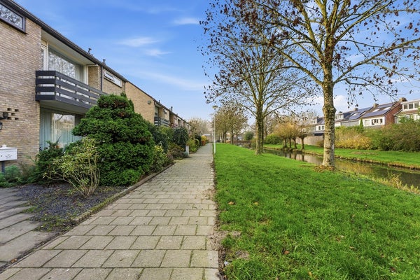 Voortuin: De voortuin (ca. 3,80 x 6,10 m) ligt op het noordwesten en is ingericht met bestrating, tuinborders en enkele boompjes. Voor de woning loopt alleen een wandelpad, waardoor er geen auto’s voorbijkomen en de ligging rustig is. Aan de voorzijde grenst de tuin aan een slootje, waar in de zomer bijvoorbeeld gevist kan worden.