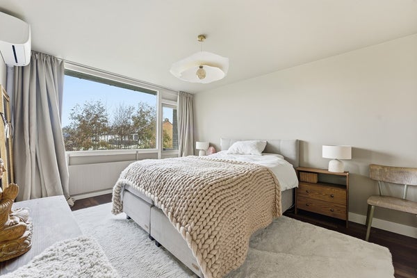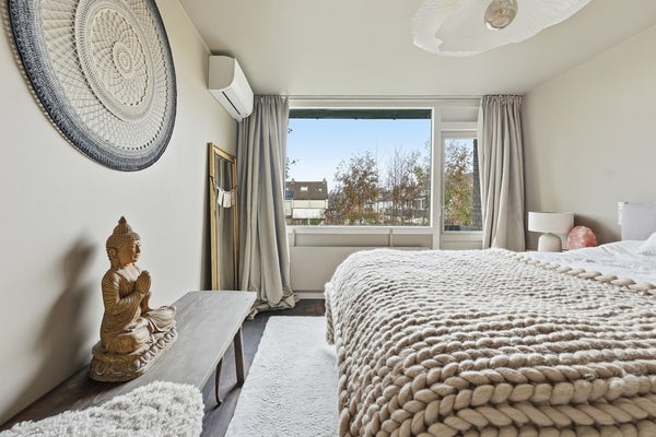 Slaapkamer 1: Slaapkamer één ligt aan de voorzijde van de woning en biedt toegang tot het balkon. In de kamer is airconditioning aanwezig en de buitenunit staat op het balkon. Het is een ruime masterbedroom met leuk zicht op het groen en de sloot aan de voorzijde.