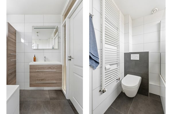 Toilet: Het toilet is gesitueerd in de hal en uitgevoerd met een zwevend toilet en een fonteintje. De ruimte is deels betegeld en voorzien van daglicht. De afwerking sluit aan bij de hal.
