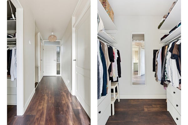 Overloop: De overloop geeft toegang tot drie slaapkamers, de badkamer, een inloopkast en de trapopgang naar de tweede verdieping. De afwerking van de hele verdieping bestaat uit een laminaatvloer, gestuukte wanden en een gestuukt plafond.