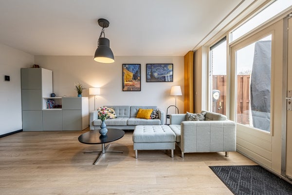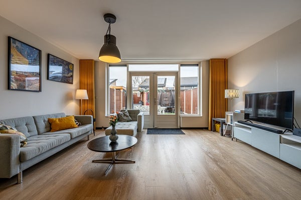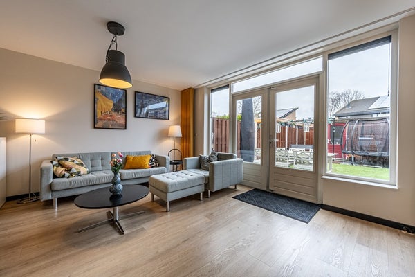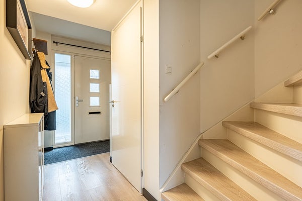 Je komt binnen in de entree waar je direct merkt dat dit huis met zorg is bewoond. Hier vind je ruimte voor de garderobe en een modern afgewerkt toilet met fonteintje. Vanuit de hal stap je de royale woonkamer binnen, waar het zit- en eetgedeelte naadloos in elkaar overlopen. Dankzij de grote raampartijen en de open verbinding met de keuken baadt deze leefruimte in het daglicht. Dit is zo’n plek waar je ’s ochtends rustig de dag begint en ’s avonds gezellig samenkomt met familie en vrienden.