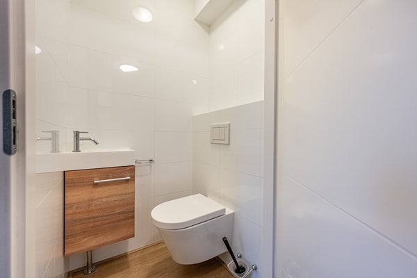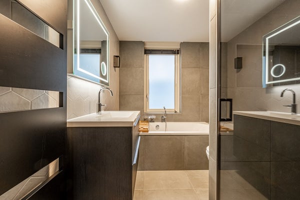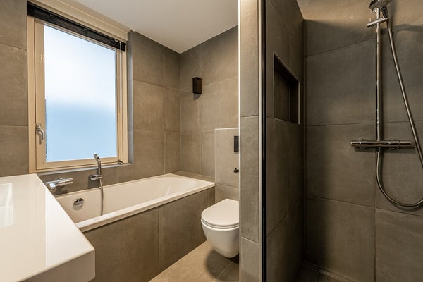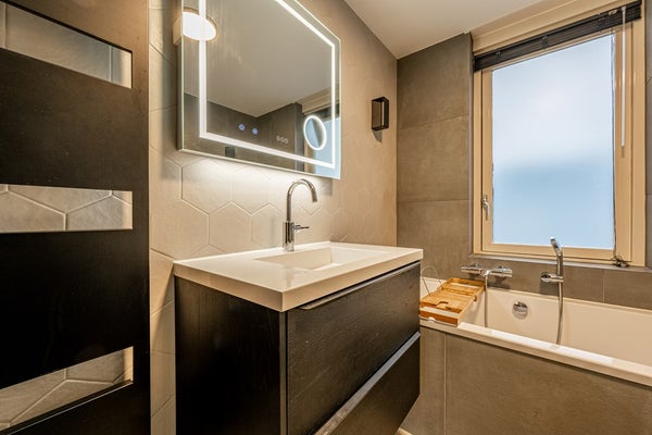 De badkamer is in 2023 volledig vernieuwd en vormt een echte eyecatcher. Neem plaats in het ligbad of kies voor de inloopdouche. Daarnaast beschikt de badkamer over een toilet en een stijlvol wastafelmeubel met verwarmde spiegel en bluetooth. Een luxe, hotelachtige sfeer die deze verdieping helemaal afmaakt.