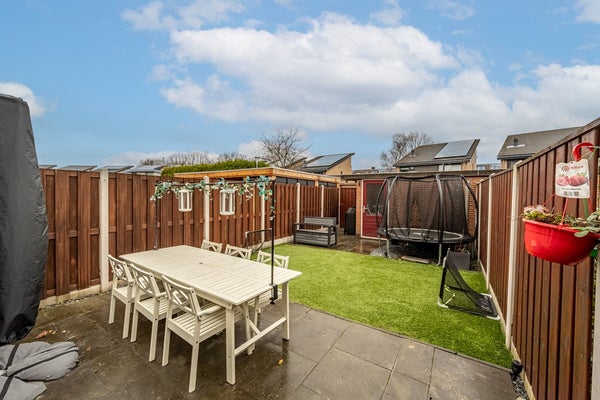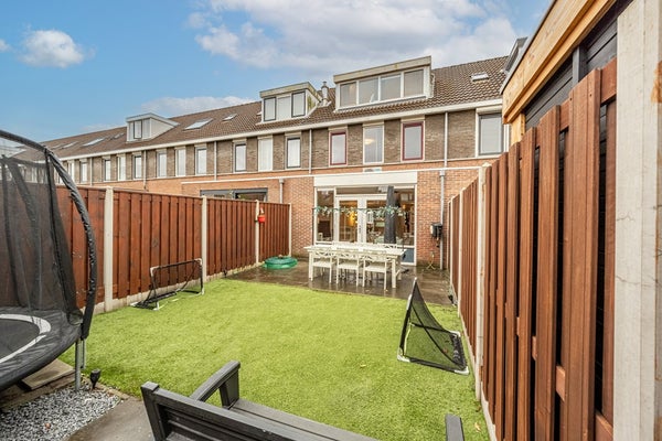 Via de woonkamer loop je zo de verzorgde achtertuin op het noordoosten in. Een heerlijke plek waar je in de ochtend kunt genieten van de eerste zonnestralen met een kop koffie. De tuin is onderhoudsvriendelijk aangelegd en biedt voldoende ruimte voor een gezellige zithoek of een speelplek voor kinderen. Achterin de tuin staat een vrijstaande stenen berging, ideaal voor fietsen, tuingereedschap en extra opslag.