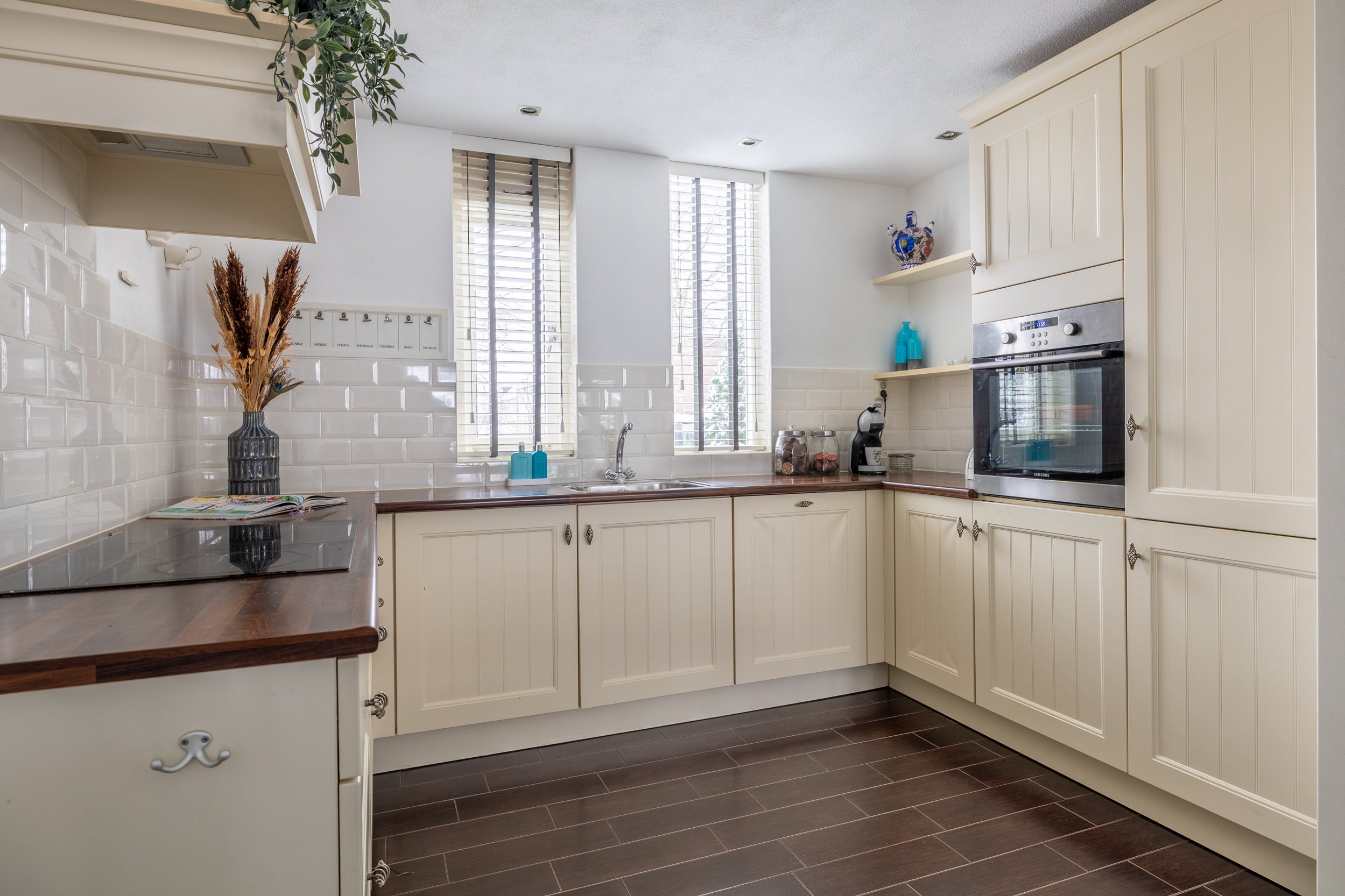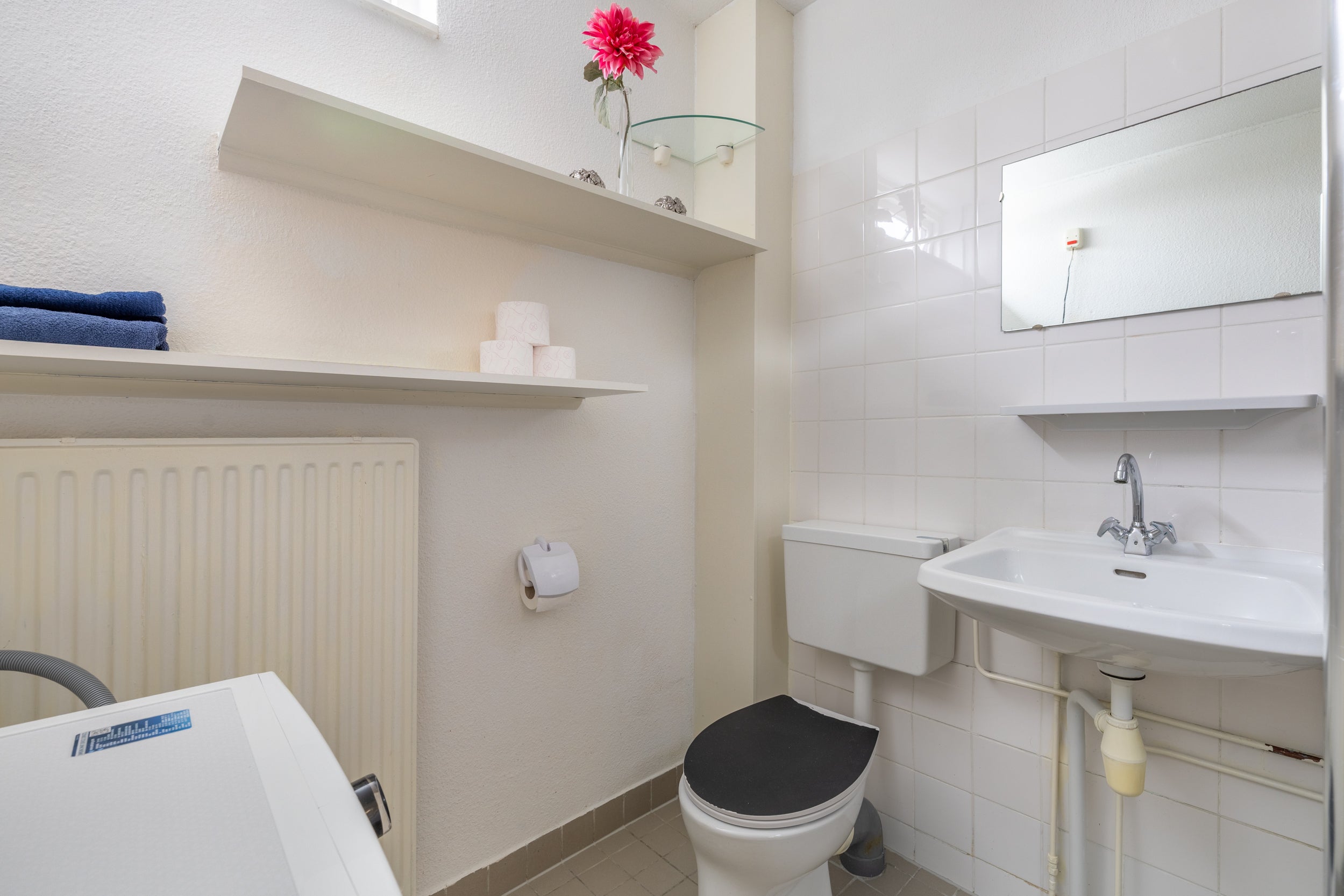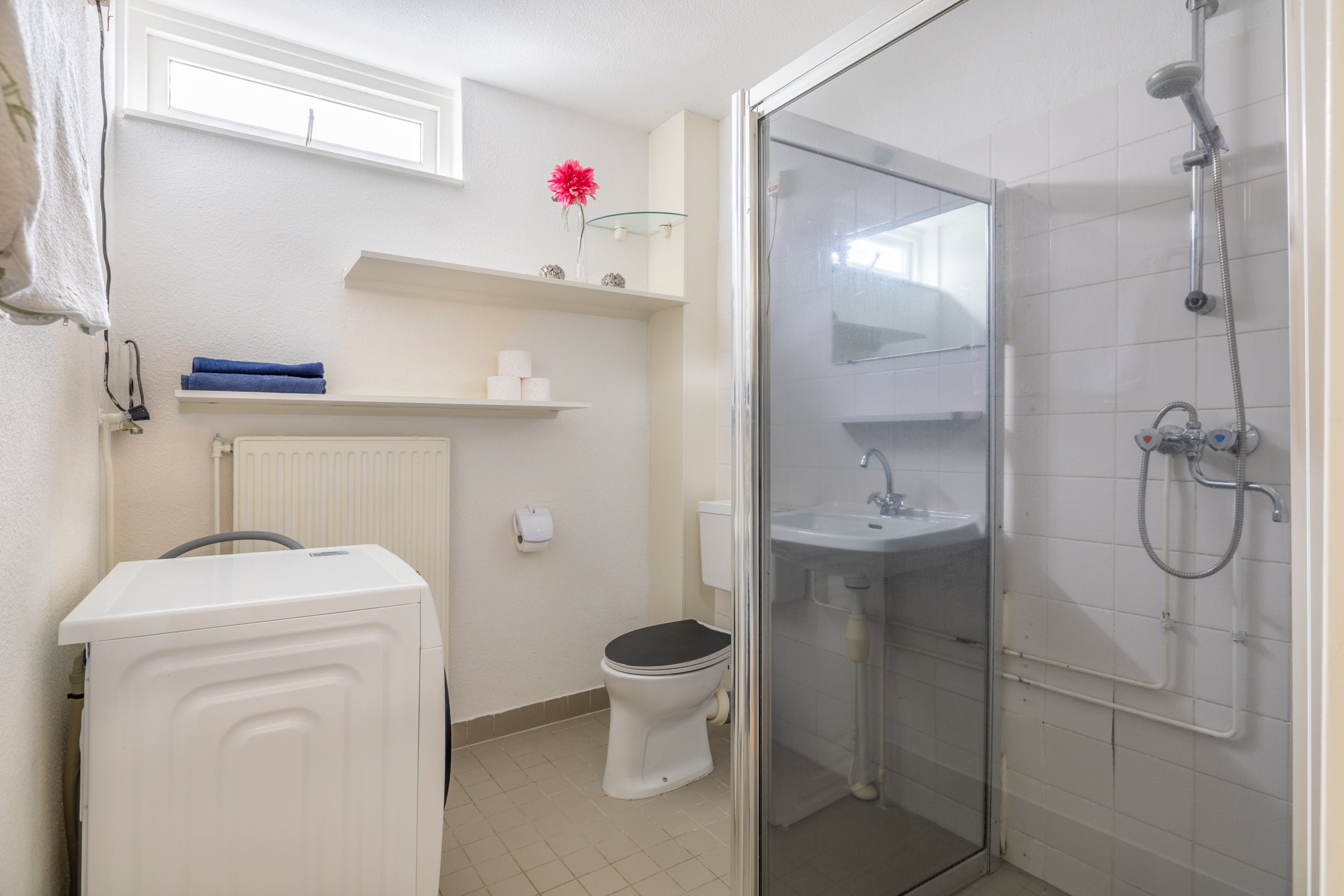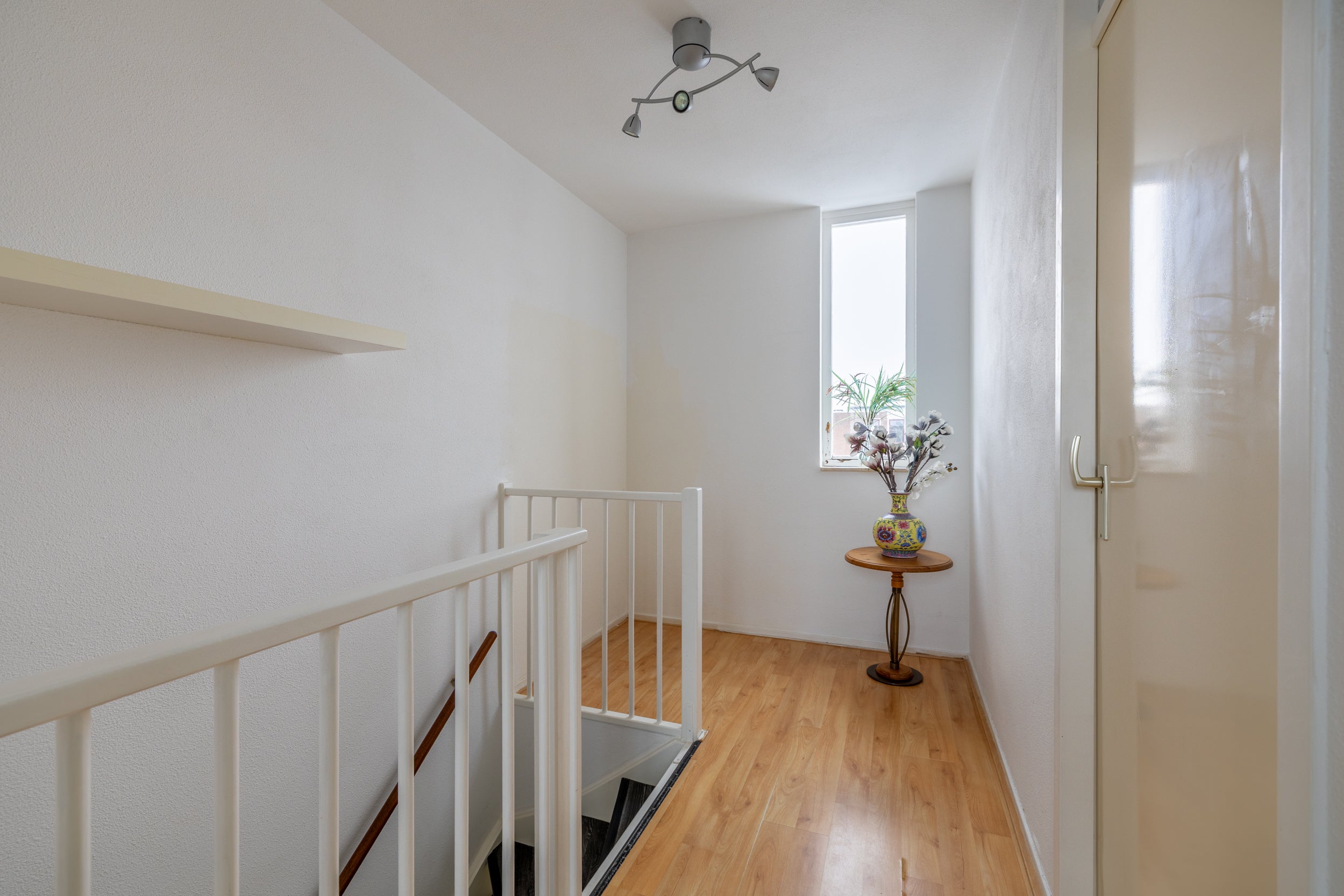 Binnen vind je een hal met toegang tot het toilet, de trap en de woonkamer met open keuken. De ruime U-vormige keuken biedt veel opbergruimte. Op de eerste verdieping zijn drie slaapkamers, een badkamer met douche, wastafel en toilet, en een aansluiting voor de wasmachine. De tweede verdieping heeft nog eens twee grote slaapkamers.