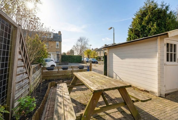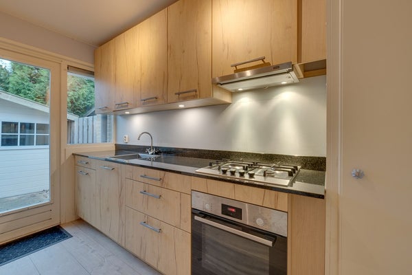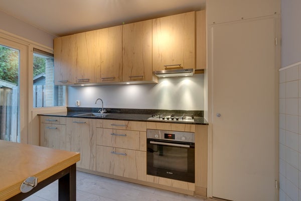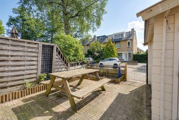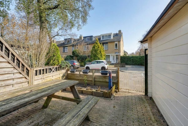 Vanuit de keuken bereik je de riante en zonnige achtertuin, waar je beschikt over een achterom en een houten berging.