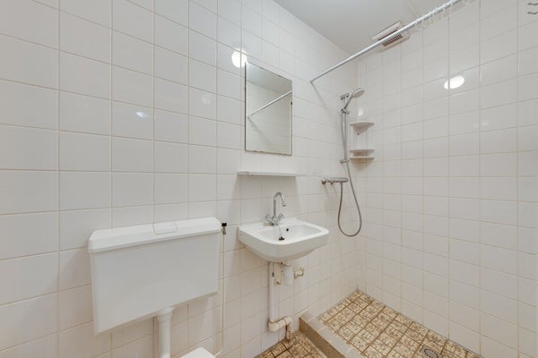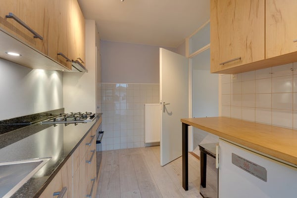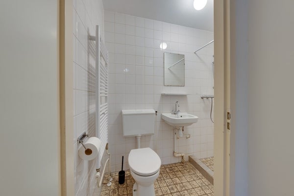 De badkamer is voorzien van een douche, wastafel en toilet. De woonkamer is tuingericht en biedt toegang tot de gesloten keuken. De keuken is in 2020 vernieuwd en uitgevoerd in een praktische wandopstelling. Deze is uitgerust met een gaskookplaat, afzuigkap, combi-oven, mengkraan en een keramiek aanrechtblad. Ook bevindt zich hier de aansluiting voor de wasmachine.