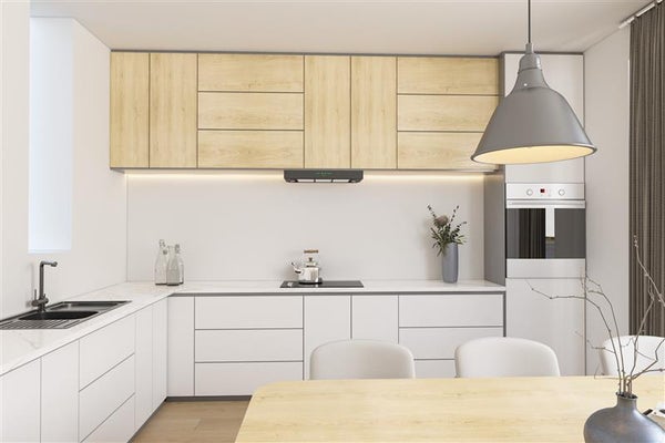 Aan de voorzijde vind je de nette halfopen keuken, compleet met koelkast/vriezer, inductieplaat met afzuigkap, vaatwasser en voldoende werkruimte. Hier kook je niet alleen de lekkerste maaltijden, maar is ook plek om samen te tafelen.