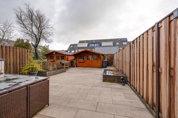 De tuin is netjes aangelegd en biedt volop ruimte voor een loungehoek, speelruimte of tuinieren en beschikt ook over een ruime schuur.