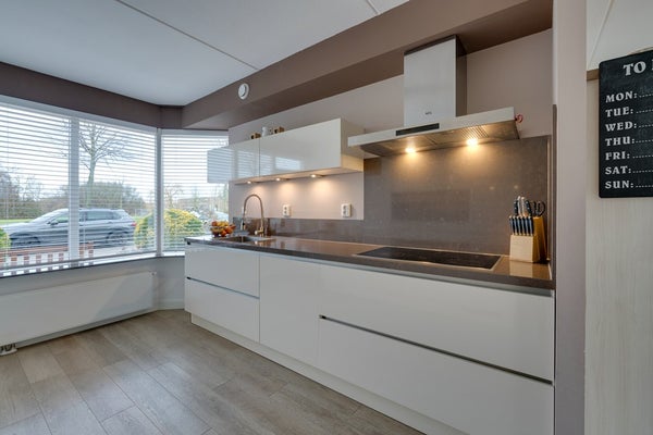 Aan de voorzijde van de woning bevindt zich de prachtige keuken. Deze is modern uitgevoerd en voorzien van diverse inbouwapparatuur van onder andere Miele en Siemens, veel kastruimte en een stijlvol composieten werkblad. De mooie keuken beschikt over een keramische kookplaat met afzuigkap, vaatwasser, koelkast, vriezer, combimagnetron en koffiemachine. Hier kook je met plezier terwijl je uitkijkt op het park.