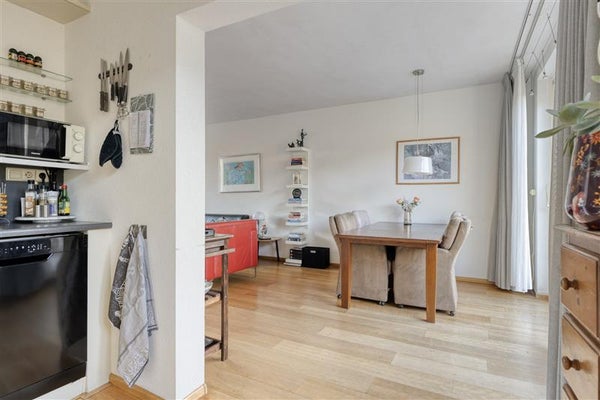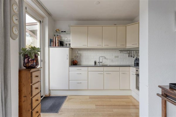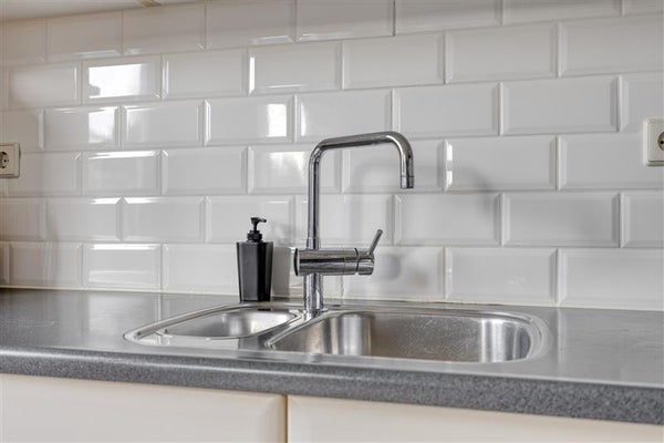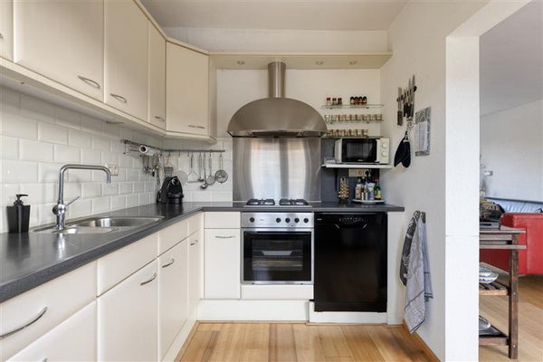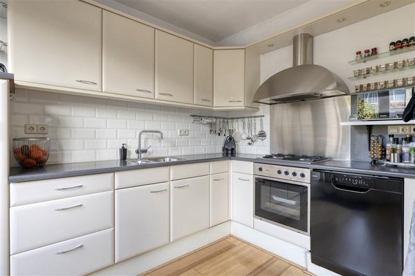 De nette halfopen keuken, opgesteld in een praktische L-opstelling. De doorgebroken indeling creëert een naadloze overgang naar de eetruimte, waardoor koken en samen eten een feestje worden. De keuken is compleet en voorzien van faciliteiten zoals een vaatwasser, koelkast, wazemkap, elektrische oven en een 4-pits gasfornuis, met tevens een handige doorgang naar de tuin.
