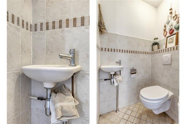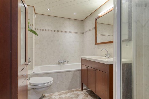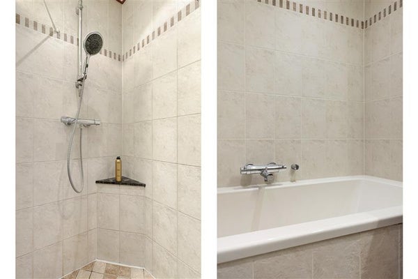 De badkamer is volledig betegeld en compleet uitgevoerd met een douche, wastafelmeubel en ligbad. Net als het toilet is ook de badkamer keurig onderhouden en direct te gebruiken.