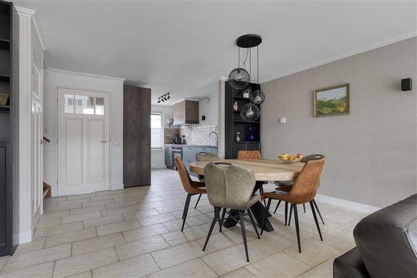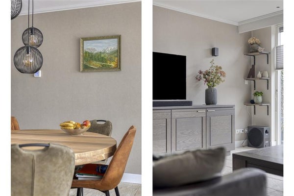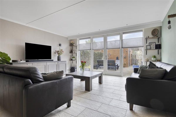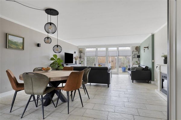 De uitgebouwde woonkamer zorgt voor heerlijk veel leefruimte. Er is meer dan genoeg plek voor een comfortabele zithoek én een grote eettafel waar je uitgebreid kunt eten met familie en vrienden. Dankzij de brede pui met openslaande deuren is de ruimte bovendien lekker licht en voelt het geheel extra ruim aan.