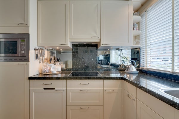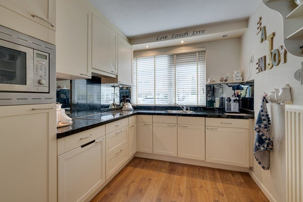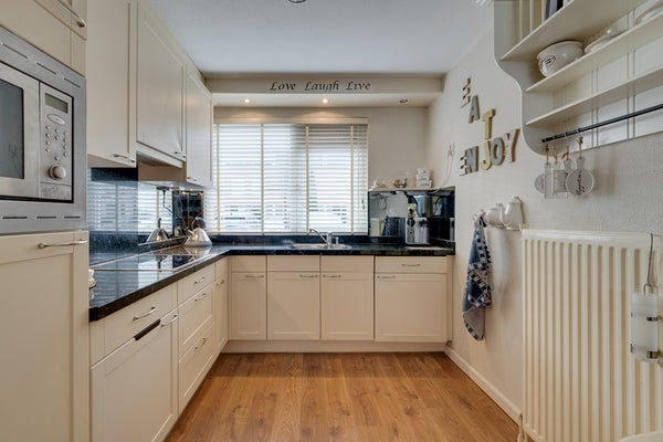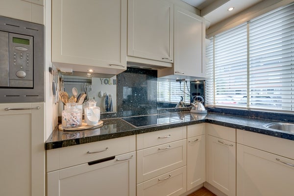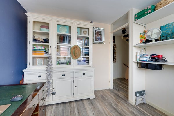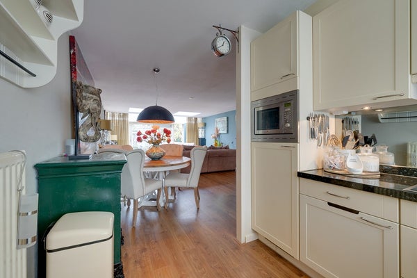 Door de uitbouw en de lichtstraat is dit een bijzonder aangename leefruimte met veel natuurlijk daglicht. Er is voldoende ruimte voor een comfortabele zithoek en een royale eettafel. De open keuken is gesitueerd aan de voorzijde van de woning en beschikt over een functionele opstelling met verschillende inbouwapparatuur waaronder een vaatwasser (2024), keramische kookplaat met afzuigkap, koelkast en een combimagnetron. Dit alles afgewerkt met een natuurstenen blad. De begane grond vormt een prettige en open leefruimte met een fijne verbinding tussen wonen en eten.