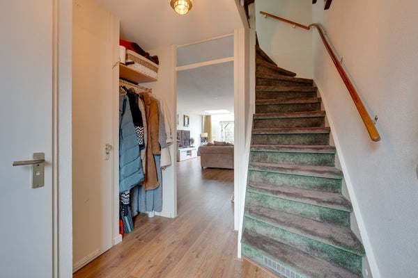 Via de voortuin kom je binnen in de hal met meterkast, toilet en trapopgang naar de eerste verdieping. Vanuit de hal bereik je de ruime woonkamer.