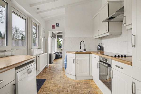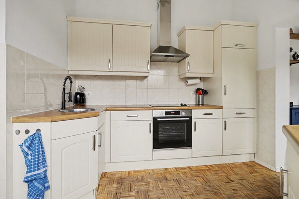 De halfopen keuken is voorzien van een lichte eiken parketvloer, deels betegelde wanden en strak stucwerk. De keuken is uitgerust met: