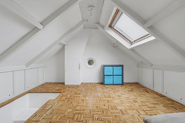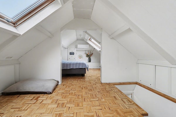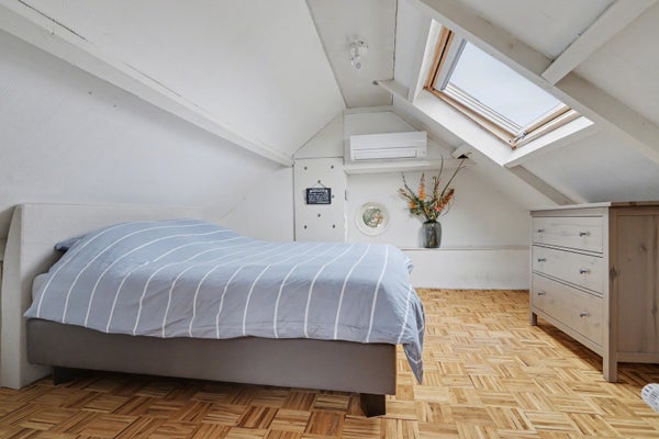 Een vaste open trap leidt naar de royale zolderverdieping, waar een derde slaapkamer is gerealiseerd. Deze ruimte is voorzien van een parketvloer, behang en kunststof kozijn met dubbel glas. Ook hier is een airco-unit aanwezig.