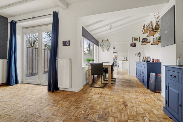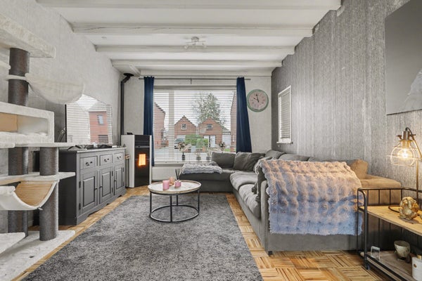De lichte woonkamer heeft een eiken parketvloer, behang wandafwerking, deels verlaagd plafond en kunststof kozijnen met openslaande deuren naar buiten. Een grote pellet kachel zorgt voor extra sfeer. De woonkamer staat in open verbinding met de keuken.