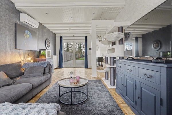 De royale opstelling biedt veel werk- en opbergruimte. De woonkamer en keuken zijn te verwarmen en te koelen via een airco-unit of de pellet kachel.