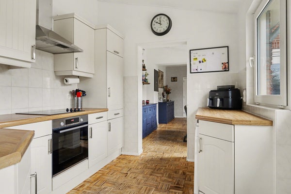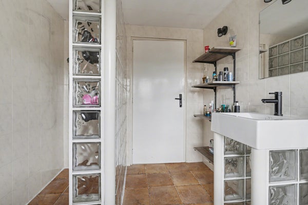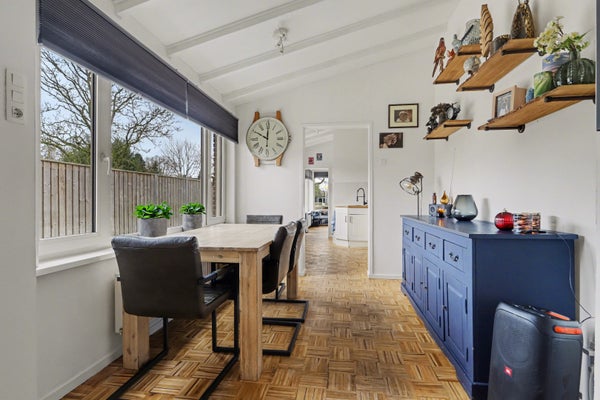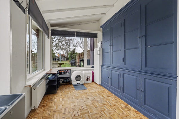 Aangrenzend aan de keuken bevindt zich een tweede hal met parketvloer, toegang tot de technische ruimte (met CV-ketel uit 2023) en aansluiting voor het witgoed. Vervolgens is er nog een ruime bijkeuken.