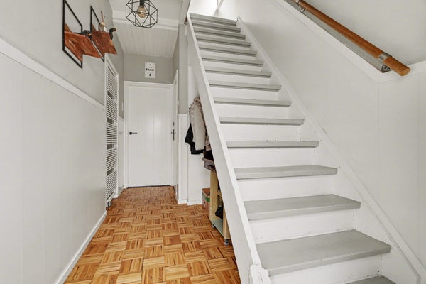 De ruime hal/entree geeft toegang tot de woonkamer en de trap naar de eerste verdieping. Hier bevinden zich tevens de meterkast (met voldoende groepen), het toilet en praktische opbergruimte onder de trap. De hal is afgewerkt met een parketvloer, lambrisering en behang.