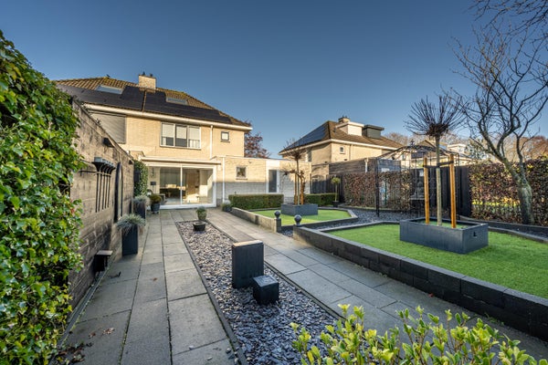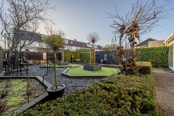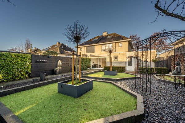 De ruime achtertuin is gelegen op het zuidoosten en biedt veel rust en privacy. De tuin is onderhoudsvriendelijk aangelegd met een combinatie van sierbestrating, kunstgras en beplanting.
