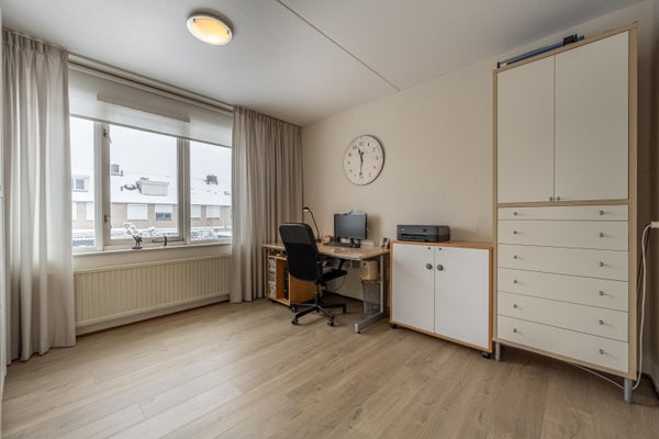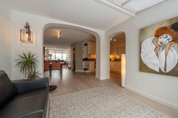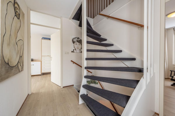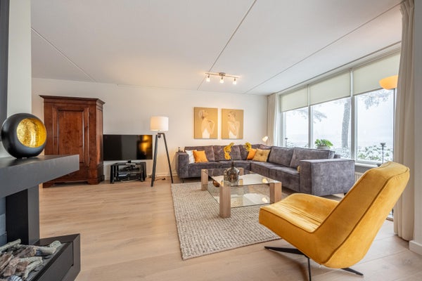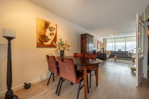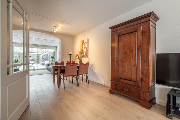De ruime woonkamer is heerlijk licht dankzij de grote raampartijen, die zorgen voor een prettige en natuurlijke lichtinval. Over de gehele verdieping ligt een gelamineerde houten vloer, wat bijdraagt aan een rustige en verzorgde uitstraling.