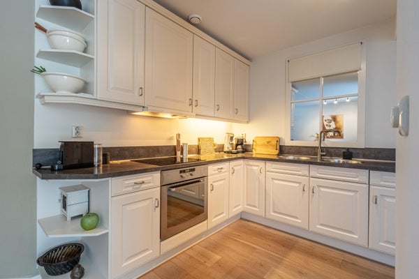 De open keuken in L-opstelling is voorzien van een vierpits keramische kookplaat met afzuigkap, oven en koelkast. De afgewerkte keukenkasten in gebroken wit in combinatie met het kunststof werkblad en twee RVS spoelbakken maken de keuken fris en tijdloos.