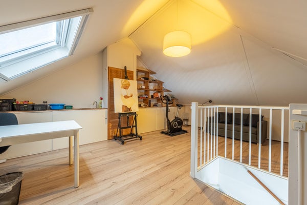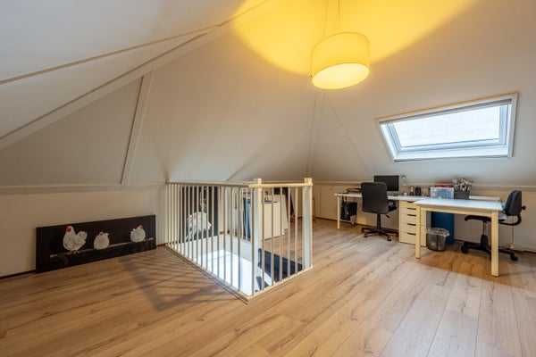 Open zolder met veel opbergruimte achter de knieschotten. De zolder is voorzien van een spoelbak, opstelling voor de cv-ketel en dakraam. De ruimte is ideaal voor een extra slaapkamer of te gebruiken als hobbyruimte.