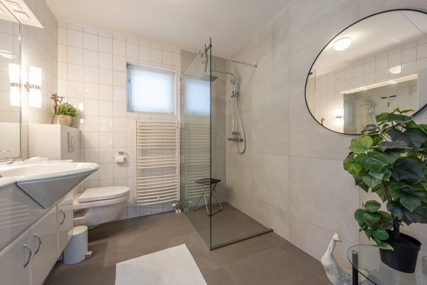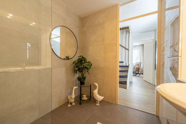 In 2023 is de badkamer gedeeltelijk gerenoveerd en uitgerust met een moderne inloopdouche met regendouche en een hangtoilet. Het badkamermeubel is afkomstig uit de oorspronkelijke badkamer en vormt een praktisch geheel met de vernieuwde inrichting.