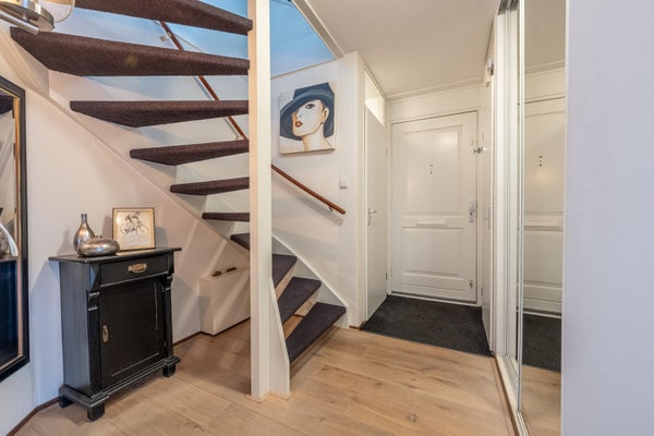 Entree van de woning met gerenoveerd toilet (2021), meterkast, inbouwgarderobe en trapopgang naar de eerste verdieping.