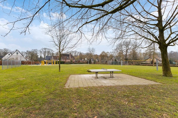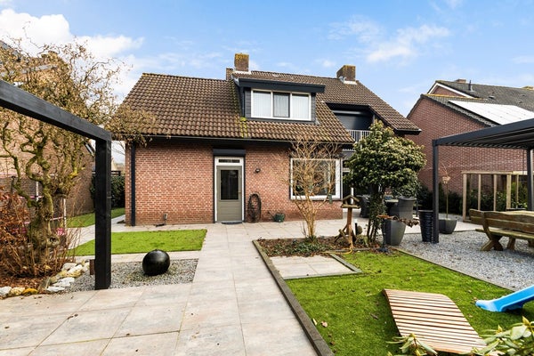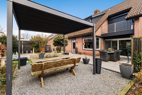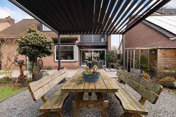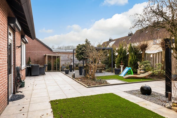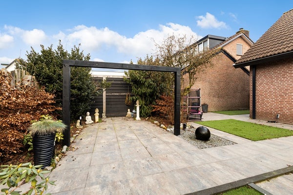 De sfeervolle en recent aangelegde (juli 2025) achtertuin is rondom de woning gelegen en biedt op ieder moment van de dag een fijne plek om buiten te ontspannen. Het geheel, incl. bewatering, is verzorgd aangelegd met een bestraat terras, groene borders en een overkapping, waardoor je zowel in de zon als in de schaduw heerlijk kunt zitten. Een ideale tuin om van te kunnen genieten. Aan de voorzijde van de woning bevindt zich de nieuwe oprit (december 2025), waardoor parkeren op eigen terrein eenvoudig mogelijk is. Daarnaast ligt aan de overzijde van de woning een speelveld, waar kinderen veilig en dichtbij kunnen spelen.