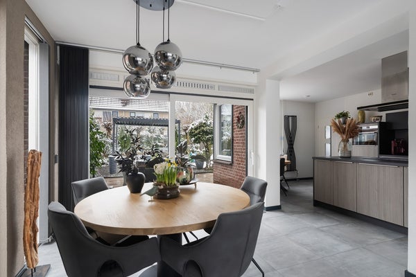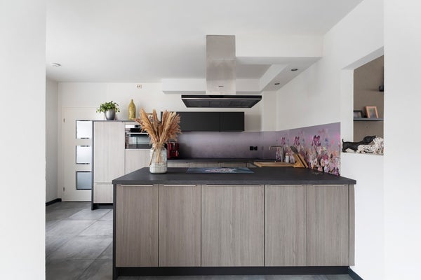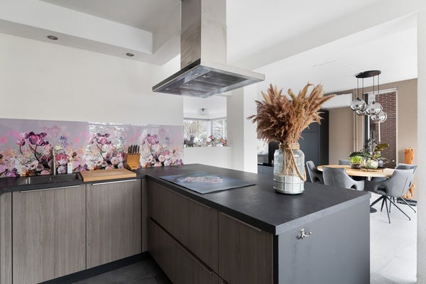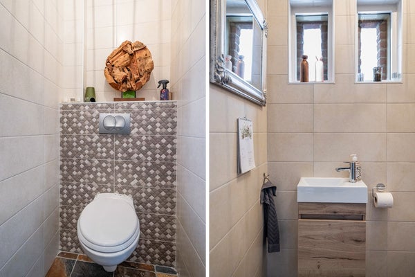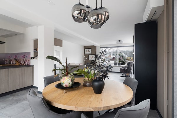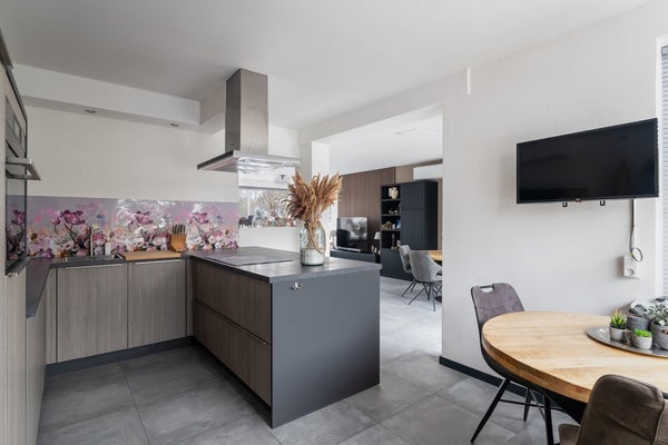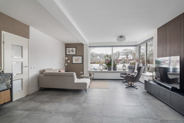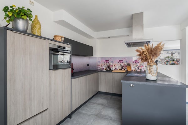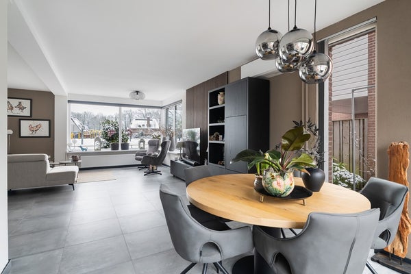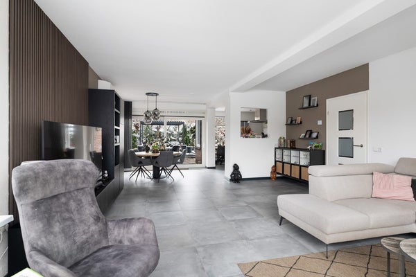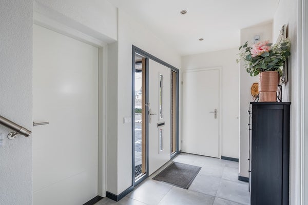 Via de entree stap je binnen in de hal, die toegang geeft tot de toiletruimte met wandcloset en fonteintje, de meterkast met glasvezelaansluiting, de trapopgang naar de 1e verdieping, de garage en de woonkamer. De royale woonkamer is een heerlijke leefruimte met een strakke plavuizenvloer en comfortabele vloerverwarming. De ruime opzet maakt het eenvoudig om zowel een royale zithoek als eethoek te creëren. Dankzij de schuifpui aan de tuinzijde vloeien binnen en buiten naadloos in elkaar en stap je zo het terras op. De moderne keuken (2022) staat in (half)open verbinding met de woonkamer en vormt een prettige plek voor kookliefhebbers. De U-vormige opstelling biedt veel werk- en bergruimte en is uitgerust met hoogwaardige inbouwapparatuur, waaronder een inductiekookplaat, afzuigkap, vaatwasser, koelkast, combi-oven en Quooker. Vanuit de keuken is de bijkeuken bereikbaar. Deze praktische ruimte geeft toegang tot de achtertuin, de (betonnen) provisiekelder en de garage. De garage is opgedeeld in twee delen en beschikt over aansluitingen voor wasmachine en droger.