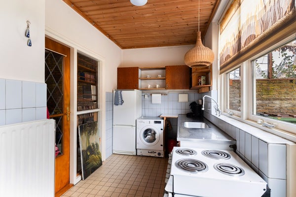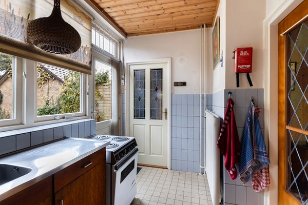 Via de entree kom je binnen in een ruime hal met directe toegang tot de trapopgang naar de 1e verdieping, de toiletruimte, de keuken en de woonkamer. De L-vormige woonkamer is aan de voorzijde van de woning gesitueerd en profiteert dankzij de grote raampartijen van een prettige lichtinval. De gezellige houtkachel zorgt daarbij voor extra sfeer en warmte in de koude maanden. Vanuit de woonkamer is de keuken bereikbaar, voorzien van een elektrisch fornuis en een koel-/vriescombinatie. Door de scheidingswand tussen de woonkamer en keuken te verwijderen, is hier eenvoudig een sfeervolle open keuken te realiseren. In de keuken bevinden zich tevens de aansluitingen voor de wasmachine en droger. Via de loopdeur stap je bovendien zo het terras op, waardoor binnen en buiten op een prettige manier met elkaar verbonden zijn.