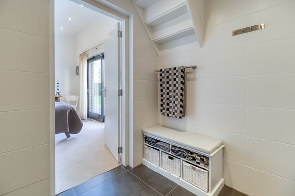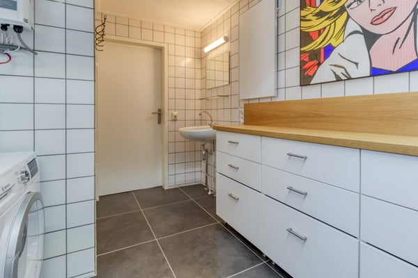 Vanuit de hal is er toegang tot een apart toilet met fonteintje, de bijkeuken en de woonkamer. In de bijkeuken is er veel ruimte voor het opbergen van huishoudelijke spullen, voorraad etc. Verder is er een wastafel en bevinden zich hier de witgoed-aansluitingen.