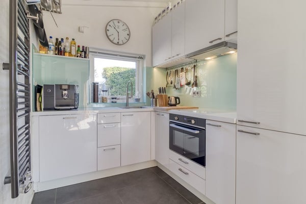 De woonkamer staat in open verbinding met de aangebouwde serre van 5,75 bij 4,24 meter groot. Via een dubbele schuifdeur komt u op het terras. Wanneer u de schuifdeur helemaal open zet betrekt u de buitenruimte optimaal bij de binnenruimte. De open keuken in hoekopstelling is voorzien van alle nodige inbouwapparatuur zoals: 4-pits inductie kookplaat, afzuigkap, spoelbak, oven, koel/vriescombinatie en vaatwasmachine. Er zijn drie slaapkamers waarvan de master bedroom zich in de aanbouw bevindt met televisie-aansluiting, schuifdeur naar de tuin en badkamer ensuite. De badkamer ensuite heeft een inloopdouche, wastafel en toilet. De tweede badkamer is eveneens voorzien van een douche, wastafel en toilet.